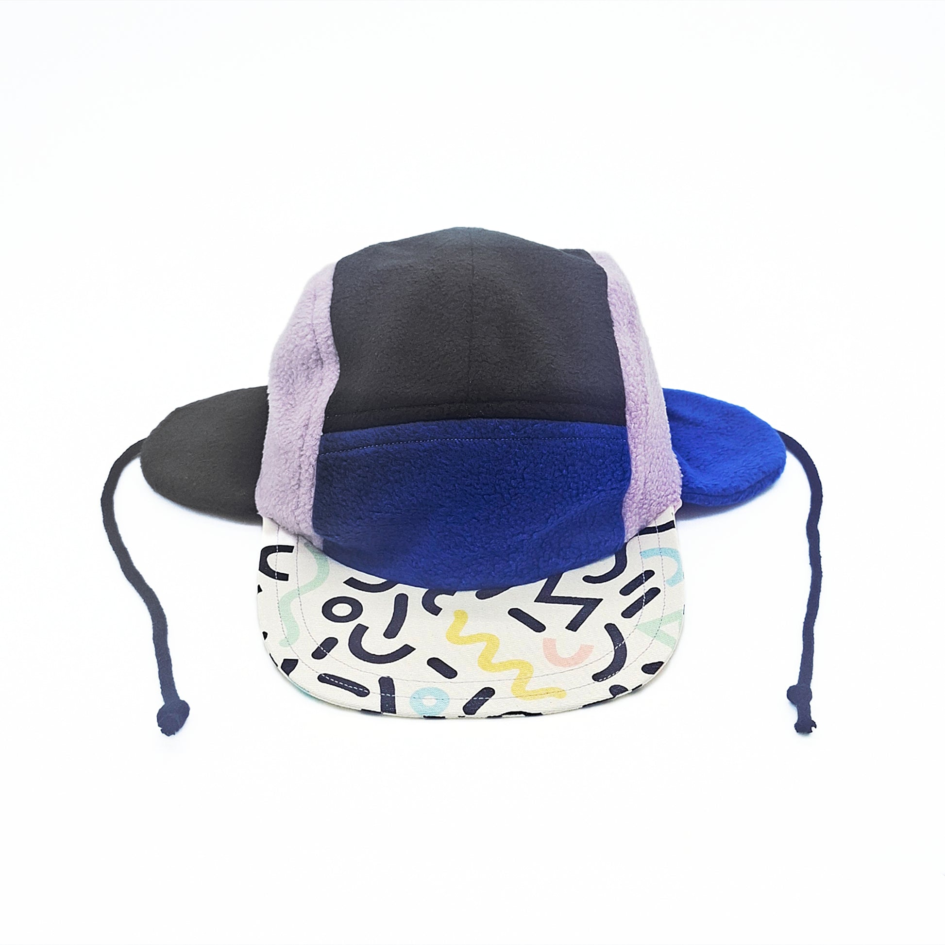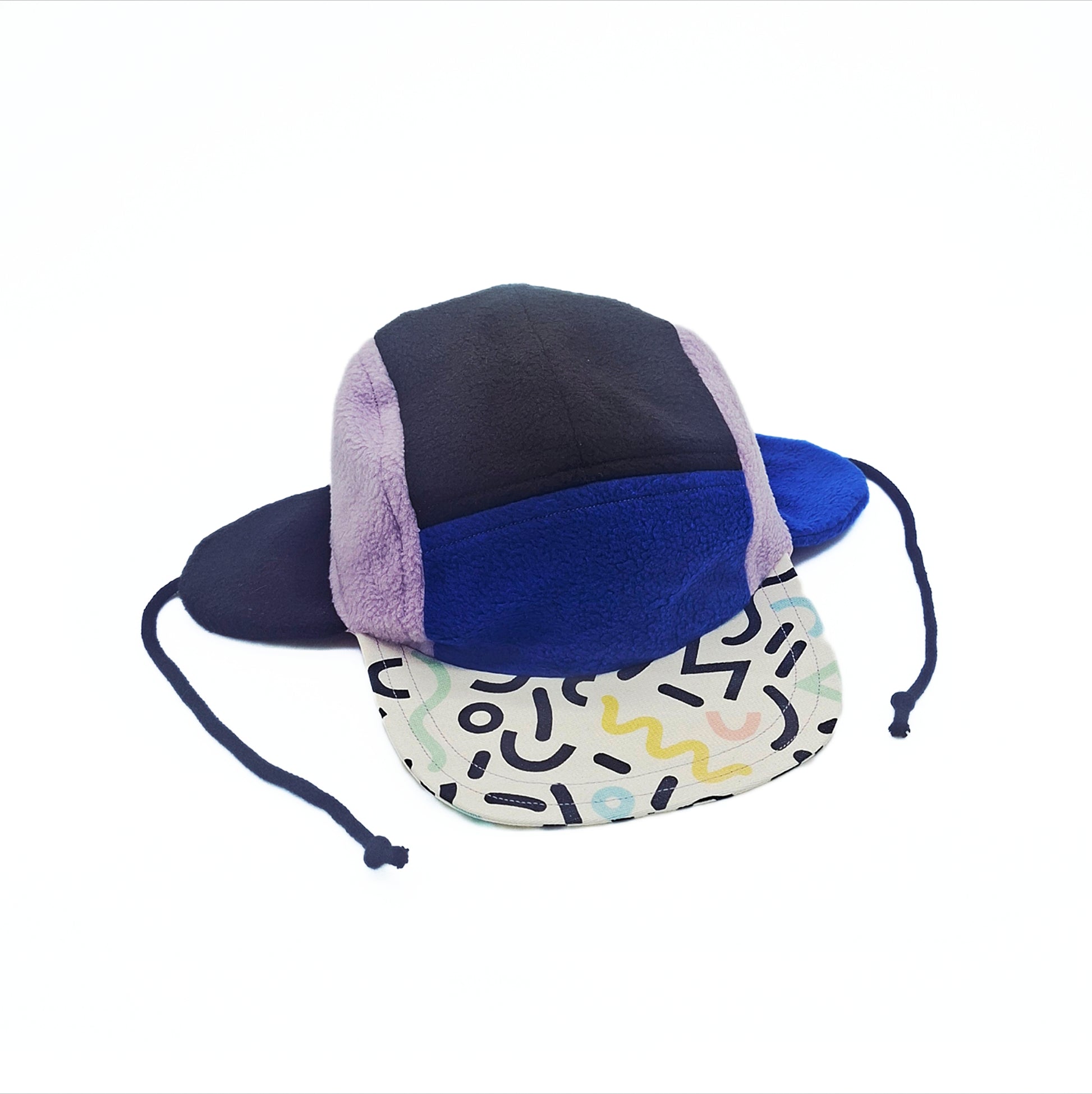 Der Oberstoff der Chapka besteht aus fliederfarbenem, blauem & schwarzem Polarfleece (100 % Polyester), der Schirm ist aus gemustertem Baumwollstoff und gefüttert ist sie aus weichem fliederfarbenen Jersey (95 % Baumwolle / 5 % Elasthan).