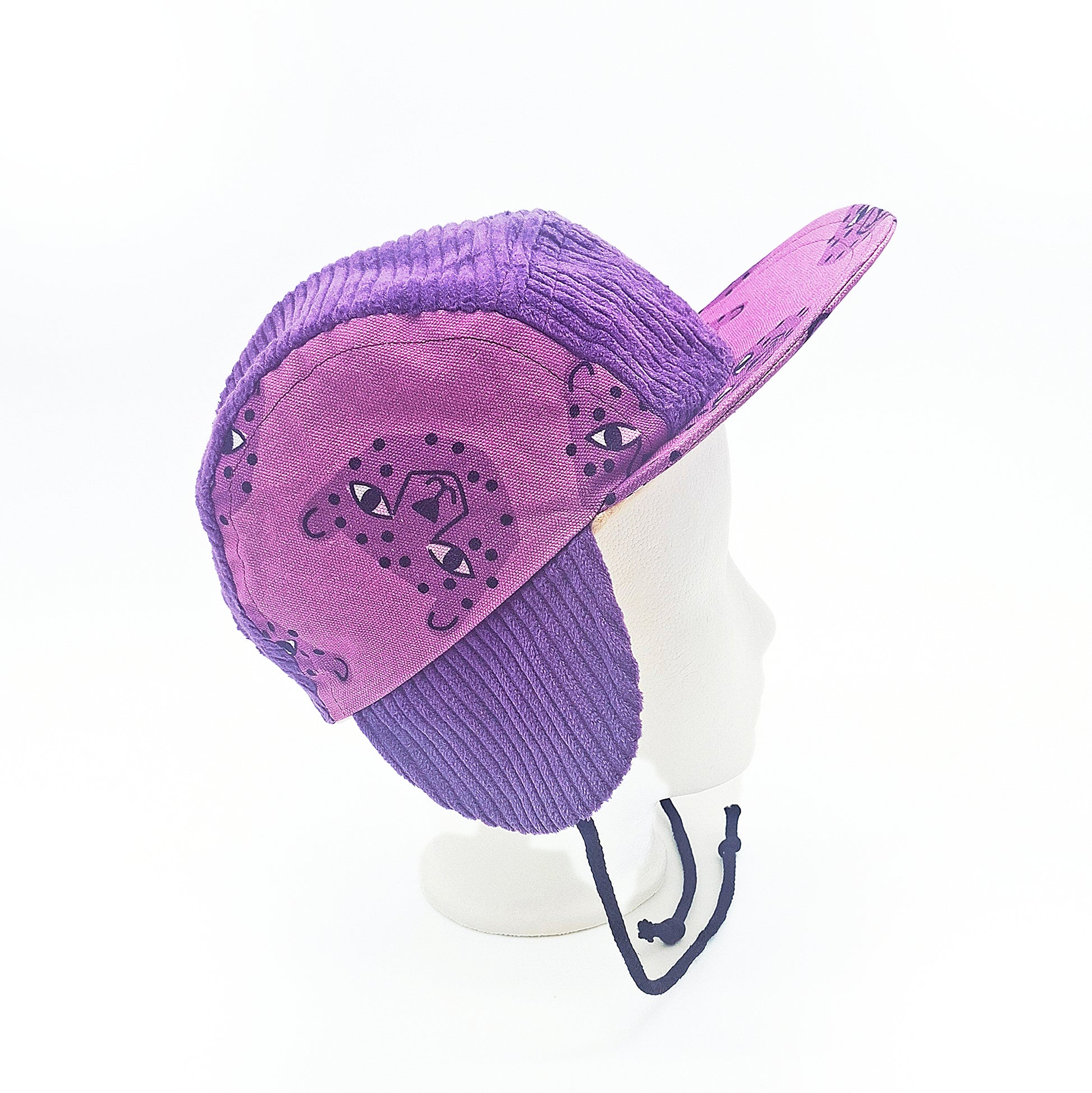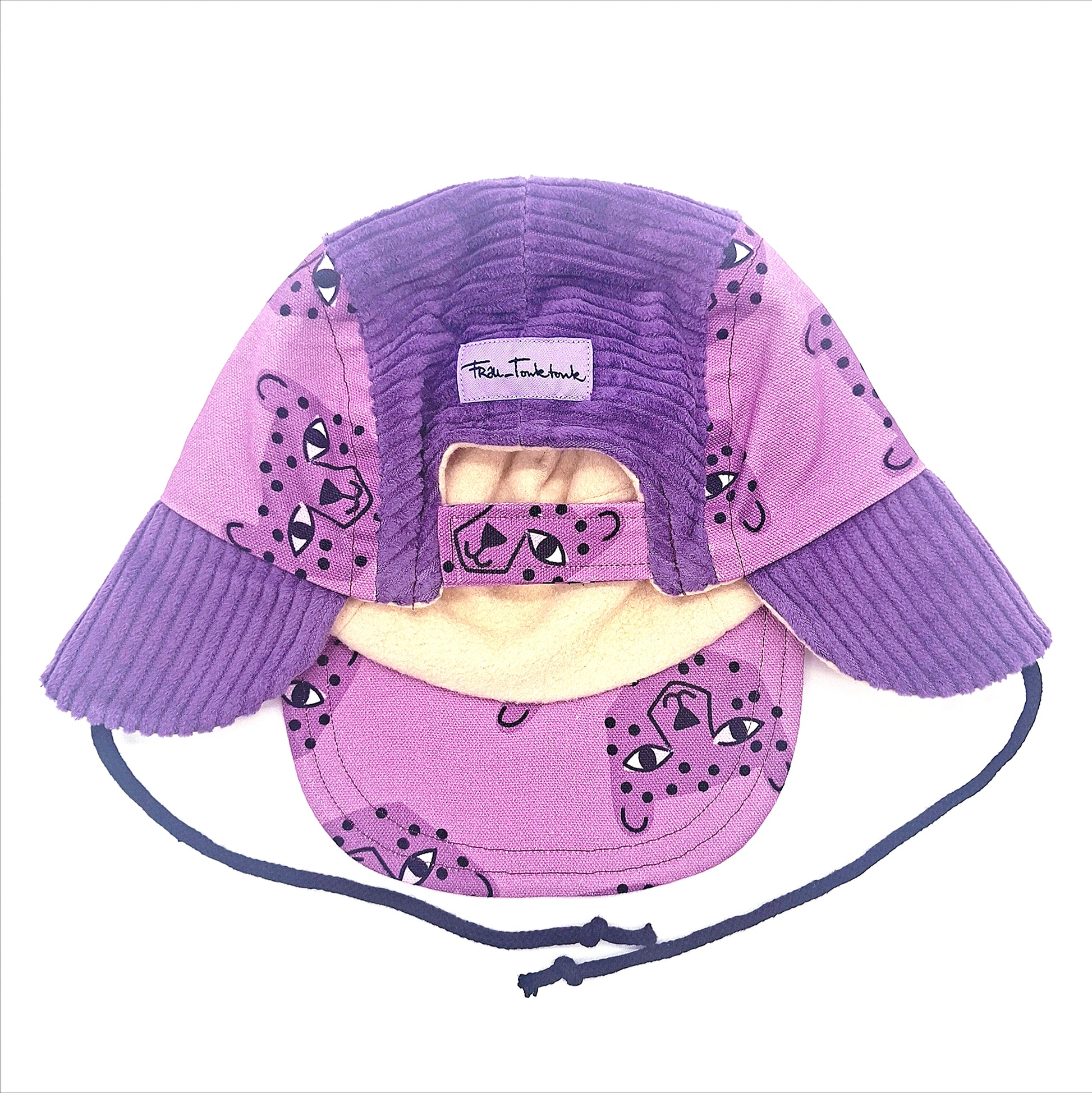 Der Oberstoff der Chapka besteht aus gemustertem Canvas (100 % Baumwolle) & lilafarbendem Breitcordstoff (100% Baumwolle) und gefüttert ist sie aus weichem cremefarbenden Baumwollfleece (100 % Baumwolle).